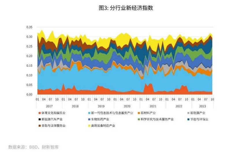 新经济指数旨在度量中国经济转型中新经济相对于传统经济或旧经济的活跃程度。新经济指数覆盖了节能环保、新一代信息技术与信息服务、生物医药、高端装备制造、新能源、新材料、新能源汽车、高新技术服务与研发、现代金融与法律服务、体育文化和娱乐等10个类别、145个细分行业。