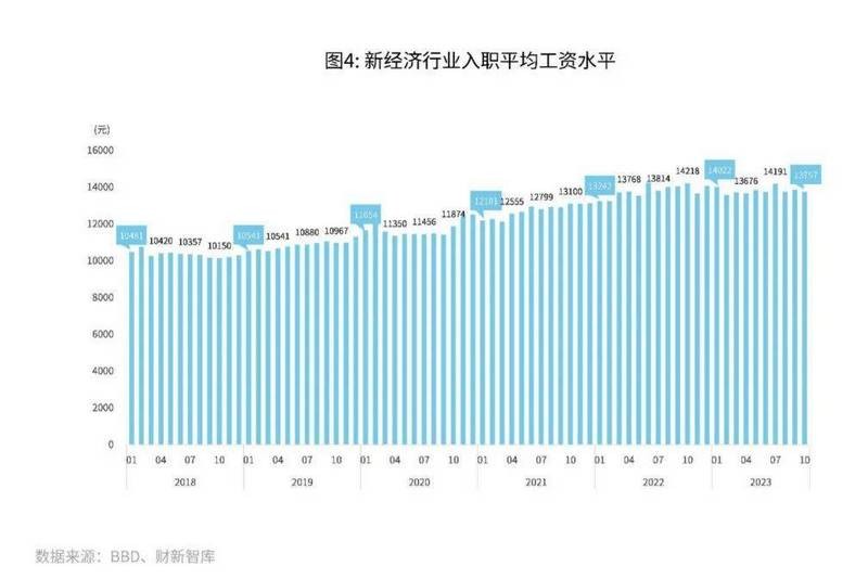 2023年10月,新经济行业入职平均工资水平为每月13757元,较上月下降121元(图4),溢价水平为3.2个百分点。